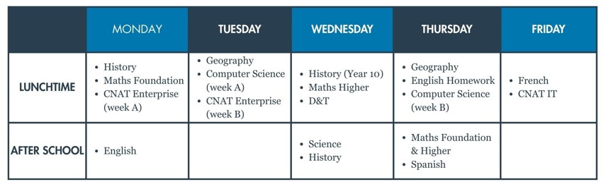 Please see GCSE exam revision sessions available in lunchtime and after school below.