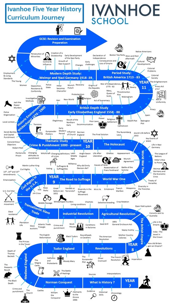 Ivanhoe’s KS3 curriculum delivers a knowledge-rich understanding of the history of Britain and the wider world from the Middle Ages to the present day. Students will explore historical concepts such as continuity and change, cause and consequence, similarity, difference and significance, and use them to make connections, draw contrasts, analyse trends, frame historically-valid questions and create their own structured accounts. They will also develop an understanding of the methods of historical enquiry, including how evidence is used to make historical claims, and discern how and why contrasting arguments and interpretations of the past have been constructed.